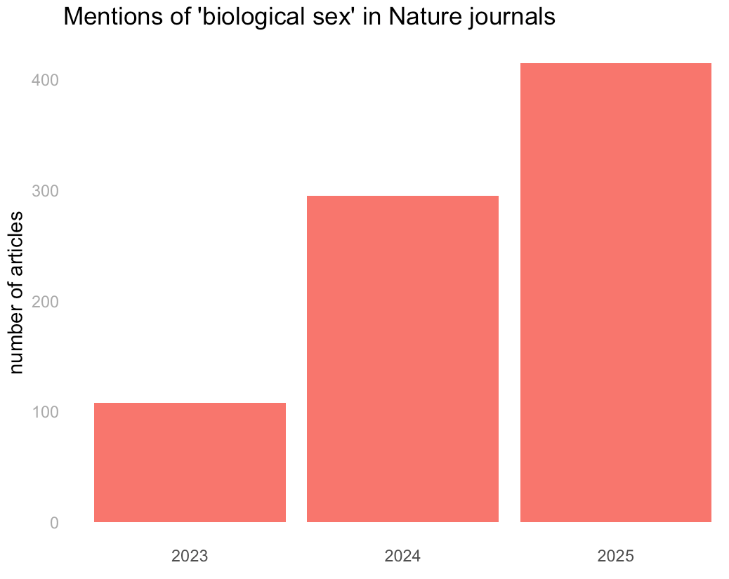 This eye-popping increase is mirrored by analyzing the works published by a single family of journals. Using RSS news feed data curated by researcher Jessica Kant, I examined mentions of “biological sex” in Nature Portfolio articles from 2023-2025. Nature Portfolio publishes over 150 academic journals including the eponymous (and prestigious) Nature.3 References to biological sex increased 284% during this period - from 108 articles in 2023 to 415 in 2025.